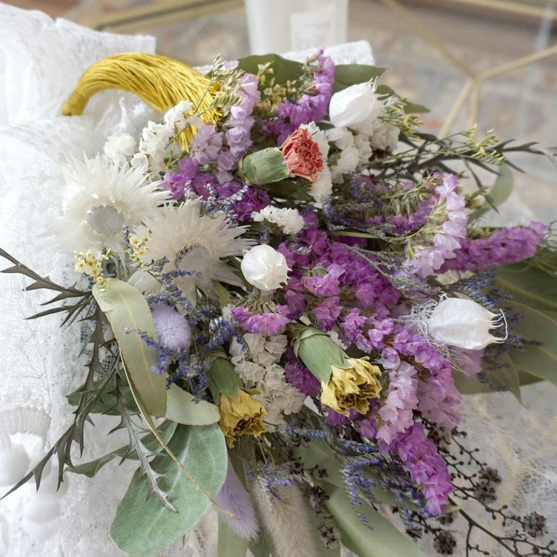 パープルやホワイト、グリーンのお色味を中心にお作りするフローリストにおまかせデザインのドライフラワーの花束です。