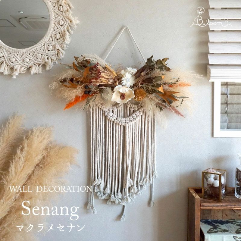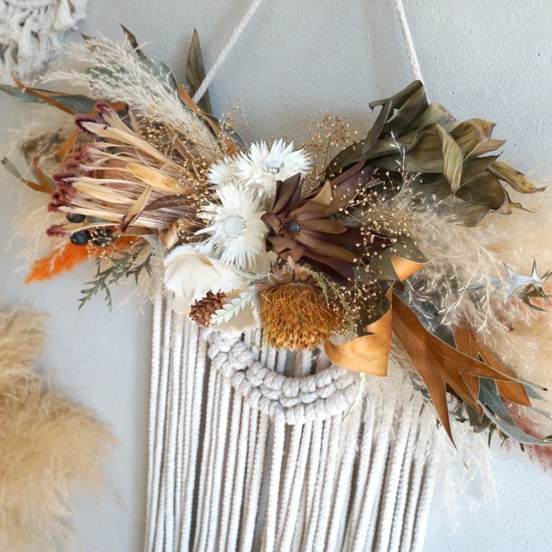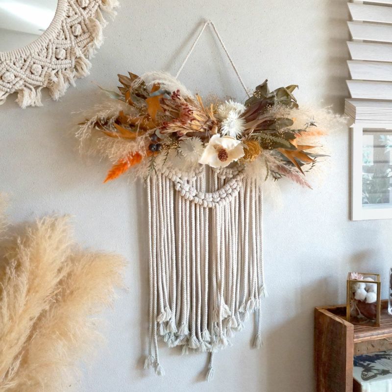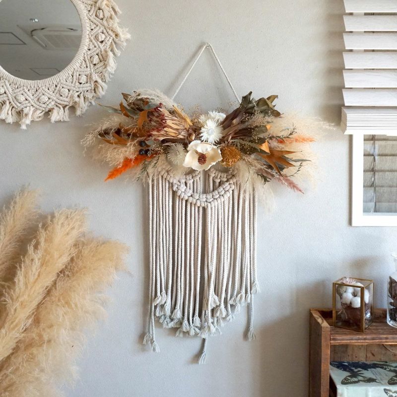 マクラメタペストリーとドライフラワーがセットになったおしゃれな壁飾り。