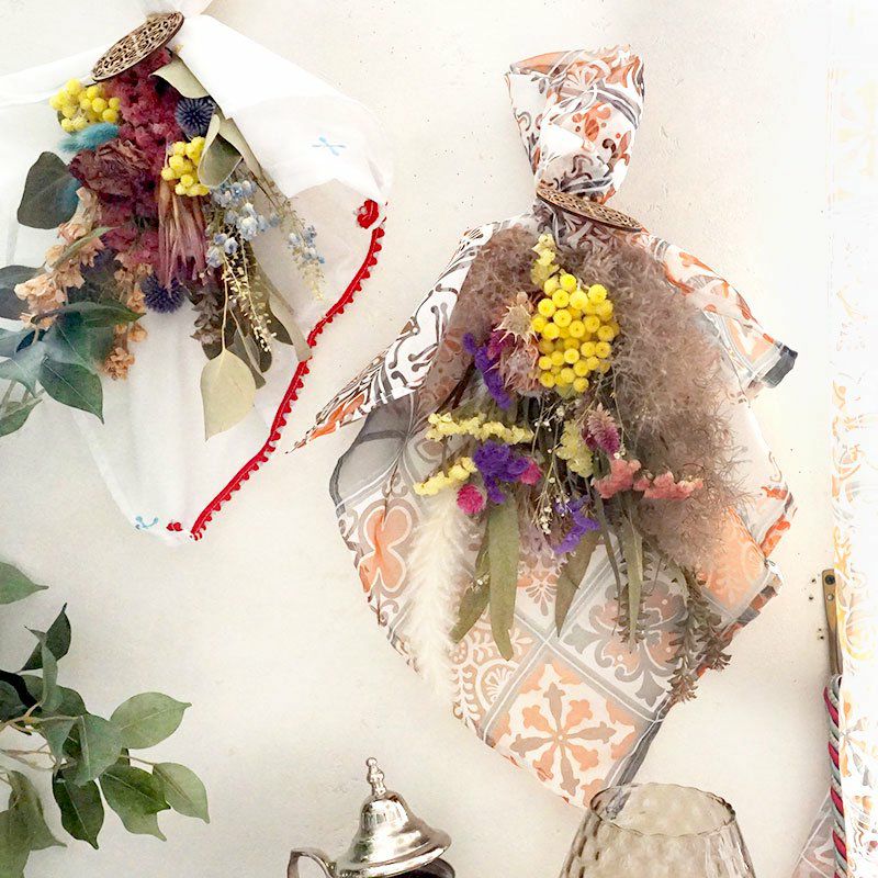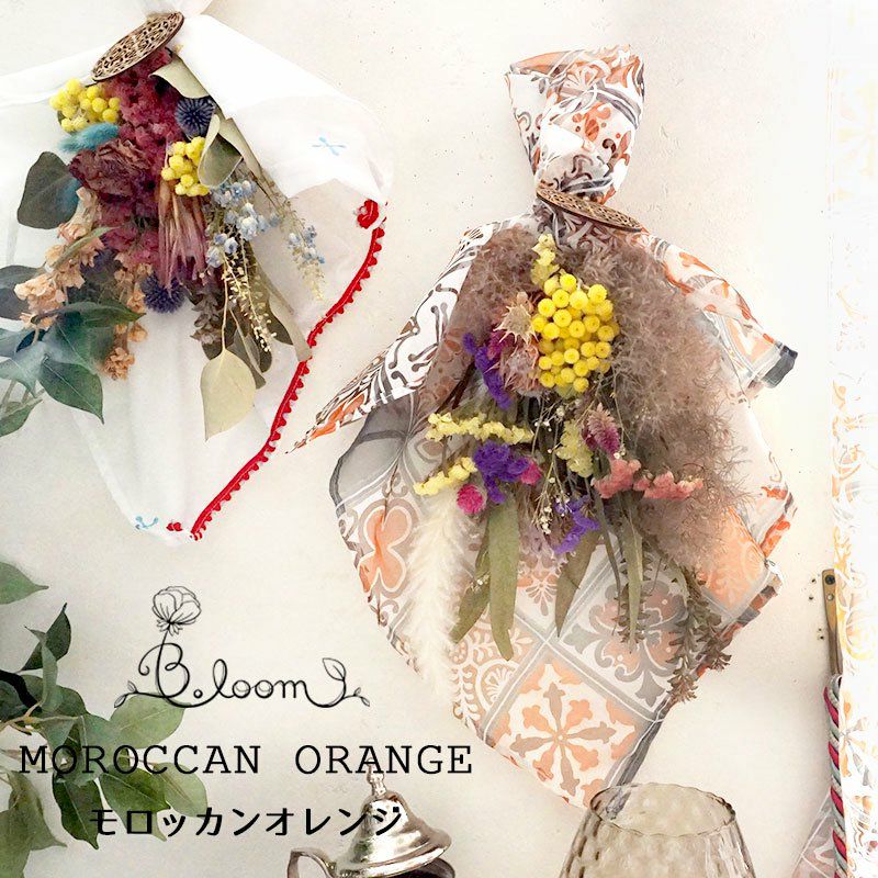 透け感のあるオパールプリントの生地を巻いたモロッカンテイストの花束。ドライフラワーの花束はギフトやちょっとしたプレゼントにもぴったり!誕生日・記念日・結婚祝いにもおすすめ。