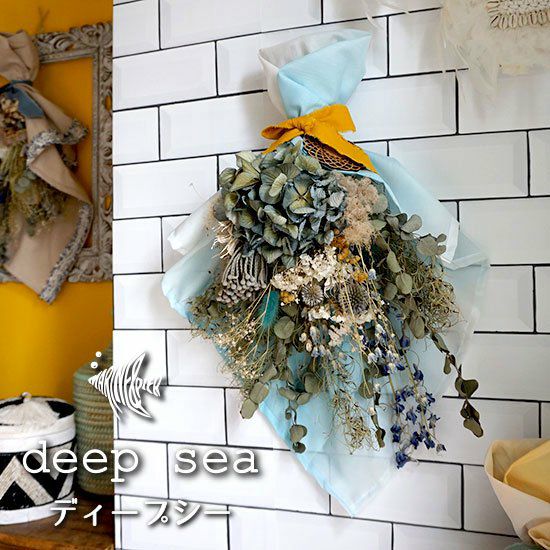 商品:オリジナルファブリクスをあしらったドライスワッグ 神秘的な深海をイメージしました。