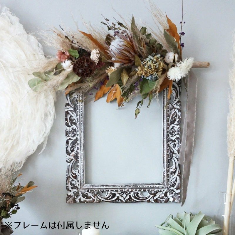 豪華なワイルドフラワーのドライフラワーを使ったナチュラルなウォールデコレーション。店舗の内装にもおすすめの装花です。