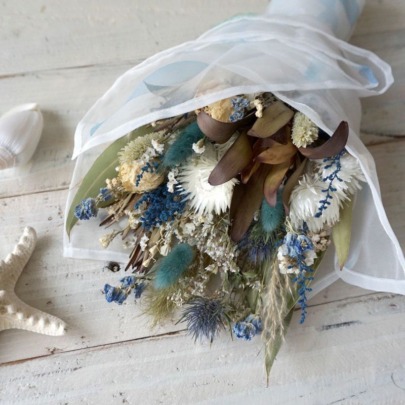 海をイメージしたプレゼントやギフトにおすすめのドライフラワーブーケ。シックな色味でまとめているので男性へのプレゼントにもおすすめです。誕生日・記念日・結婚祝い・開店祝いなどにもおすすめ。贈った後にもおしゃれなインテリアに。