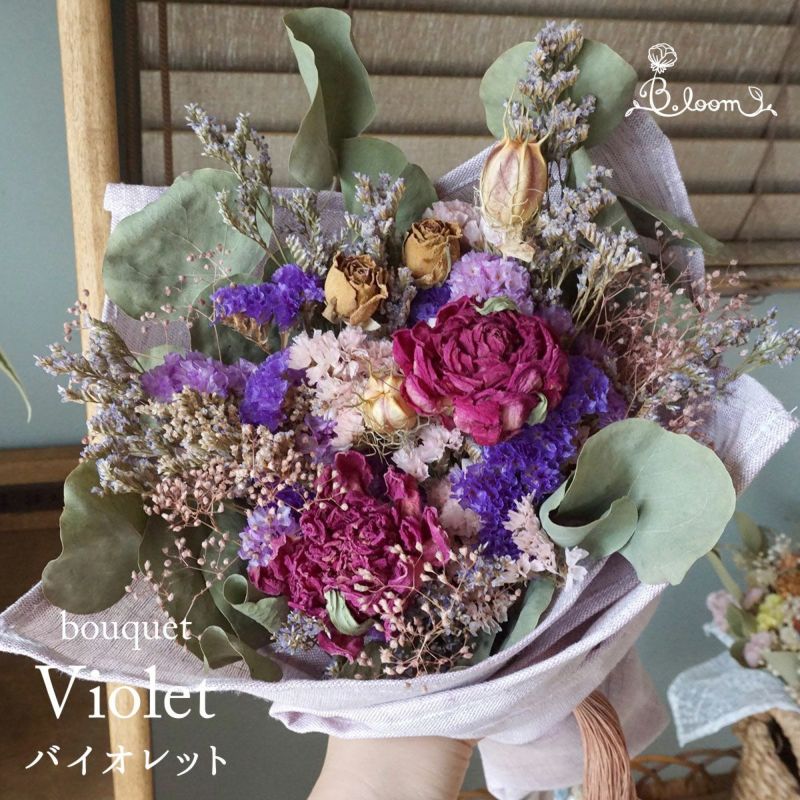 紫の芍薬やスターチスを使って、大人っぽいブーケを作りました。