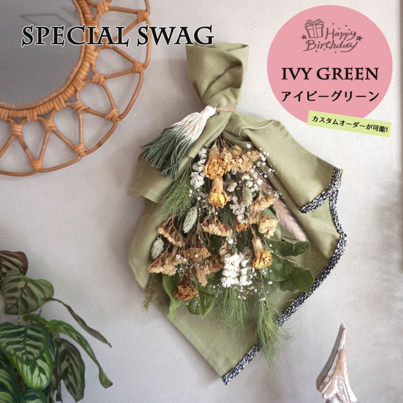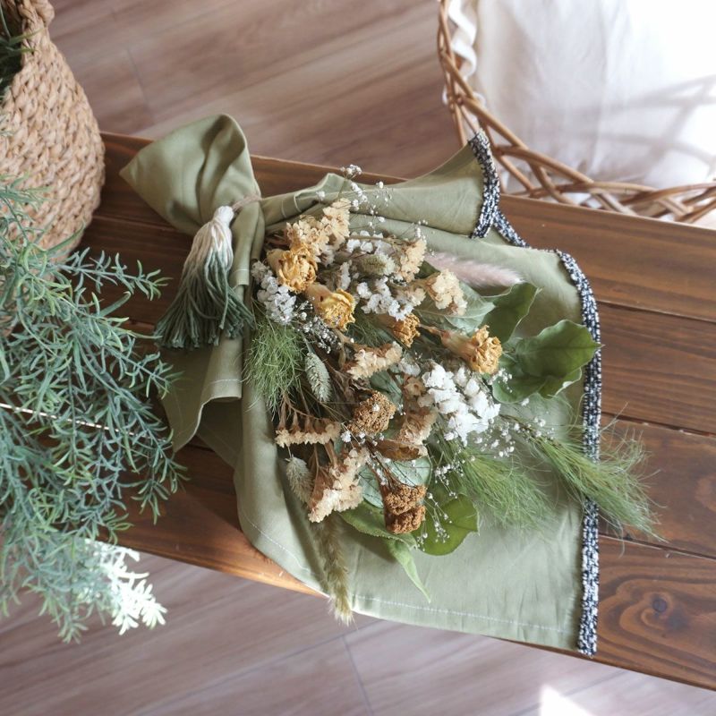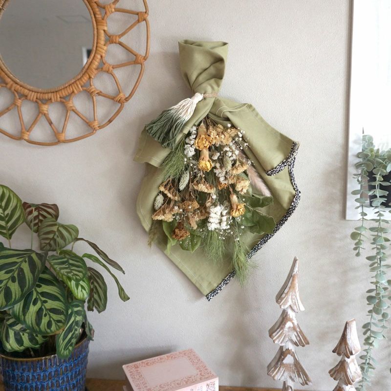 気花束を生地、ブレード、チャーム、巻き方などをお客様のお好みに合わせてアレンジ可能。