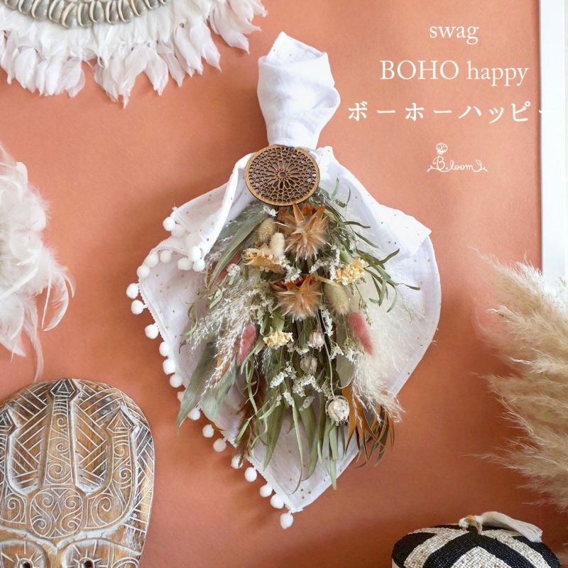 リューカデンドロンプルモーサム、パンパスグラス、グレビレアゴールドなどを使ったおしゃれなドライフラワースワッグ。ボヘミアンな雰囲気はボーホースタイルのお部屋にぴったり!プレゼントにもおすすめです。
