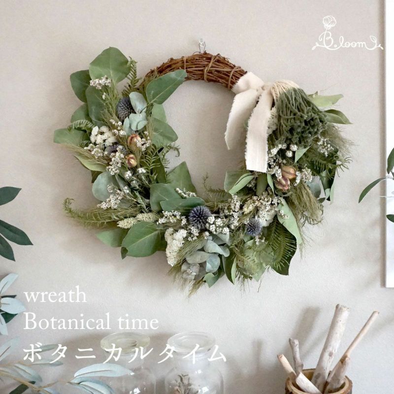 ボタニカルインテリアにおすすめなユーカリやデルフィニウム、スターチスを使ったドライフラワーリースです。