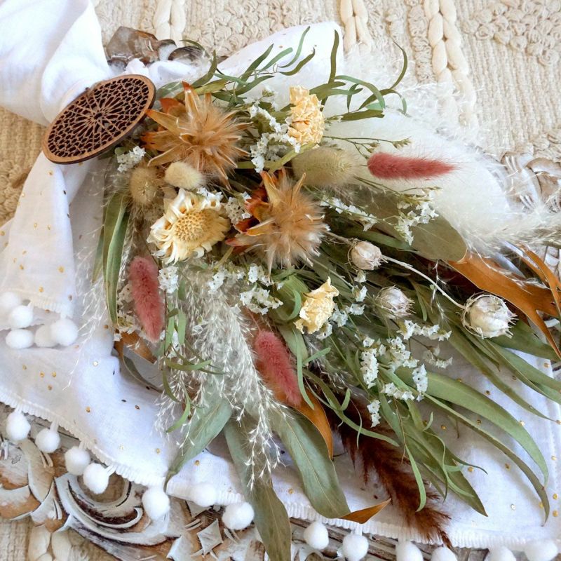 リューカデンドロンプルモーサム、パンパスグラス、グレビレアゴールドなどを使ったおしゃれなドライフラワースワッグ。ボヘミアンな雰囲気はボーホースタイルのお部屋にぴったり!プレゼントにもおすすめです。