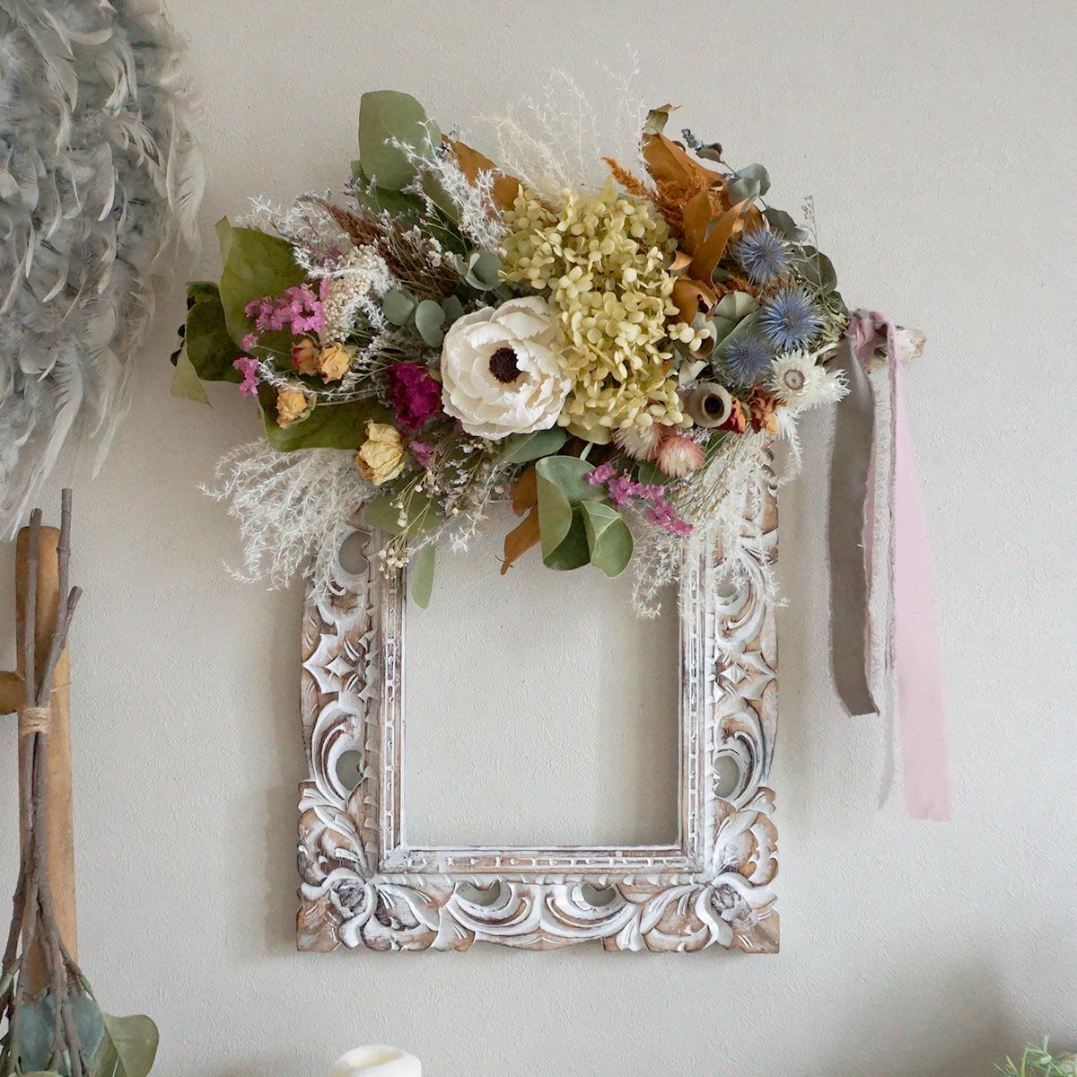 他の画像を見る 【シャビーシック】店舗の内装やお部屋の壁面におすすめ!約50cmの大きいサイズのドライフラワー壁飾り<ベリコ> 販売価格 ¥ 23,100 税込 在庫切れ 横幅約50cmの華やかなドライフラワー壁飾り。アナベルやソーラーシャクヤク、エバーラスティングやバラなどのお花が華やかな印象なので祝い花や店舗の内装にもおすすめの装花です。メッセージカードや立札を付けてギフトにいかがでしょうか。 詳細を見る お気に入りに登録する