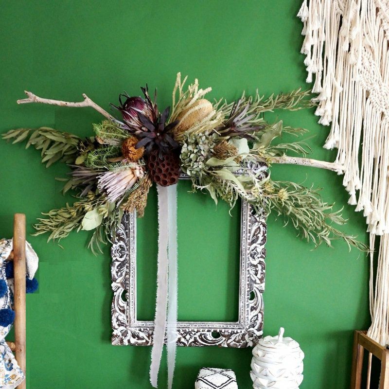 豪華なワイルドフラワーのドライフラワーを使ったナチュラルなウォールデコレーション。店舗の内装にもおすすめの装花です。