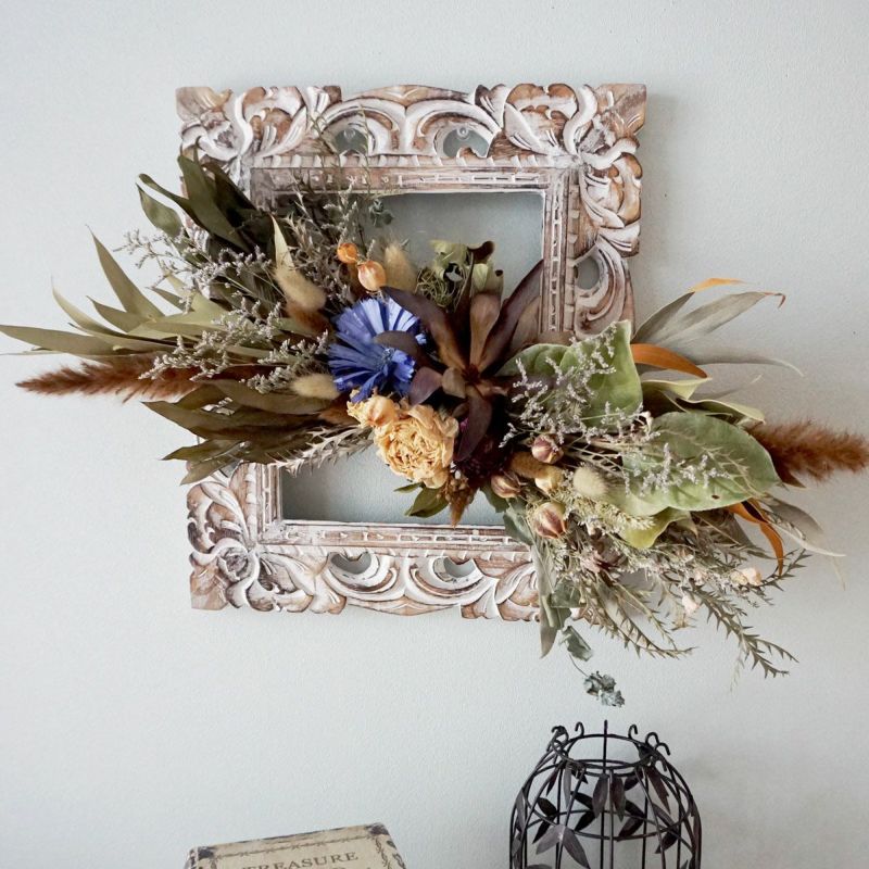 開店祝いや店内装飾、インテリアにおすすめなドライフラワー壁飾り。コットンとパンパスグラス、ソテツなどを使ってボタニカルテイストに仕上げました。