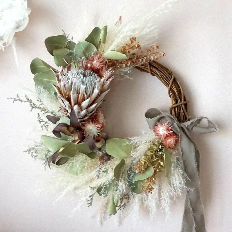 ふわふわのパンパスグラスと迫力のあるプロテアを使用したシャビーシックなウォールデコリース。幸せの象徴のリースは誕生日・記念日・結婚祝い・出産祝い・開店祝いにもおすすめ。