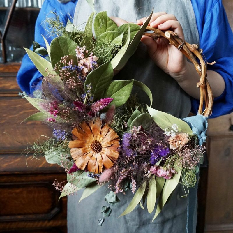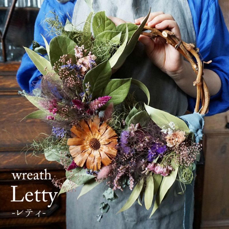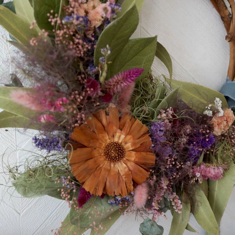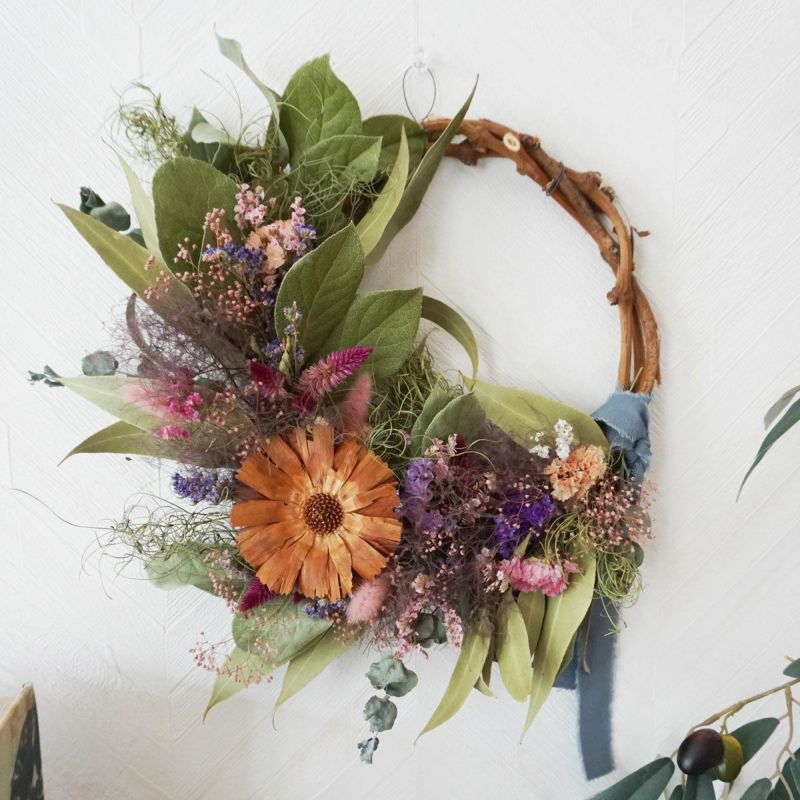 レモンリーフ、スモークツリー、ケイトウなどを中心に使用したリース。大人っぽくあしらわせていただきました。幸せの象徴のリースは誕生日・記念日・結婚祝い・出産祝い・開店祝いにもおすすめです。