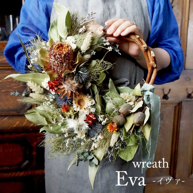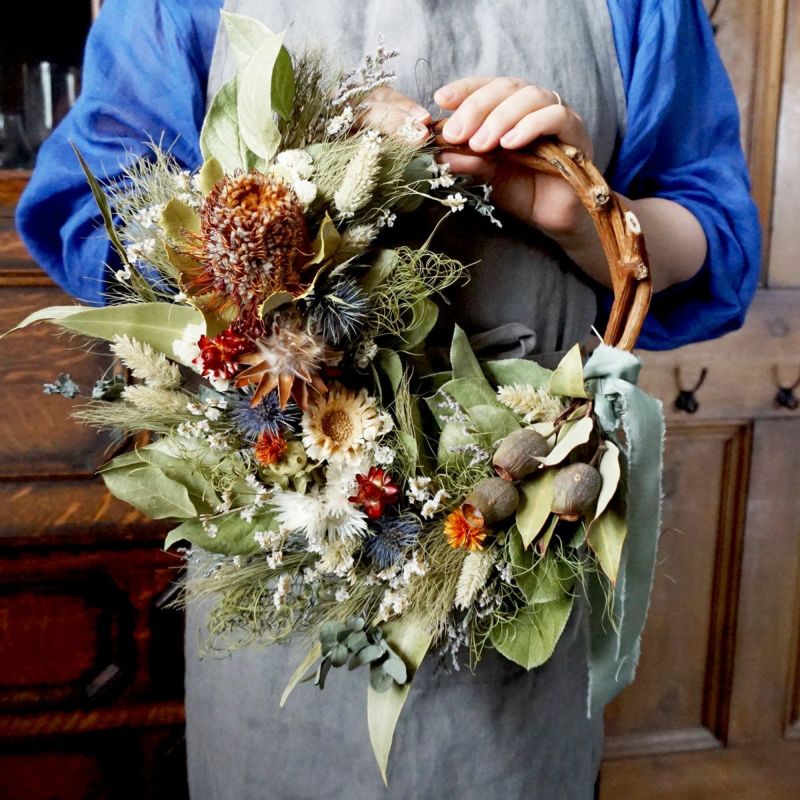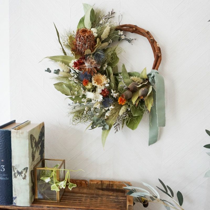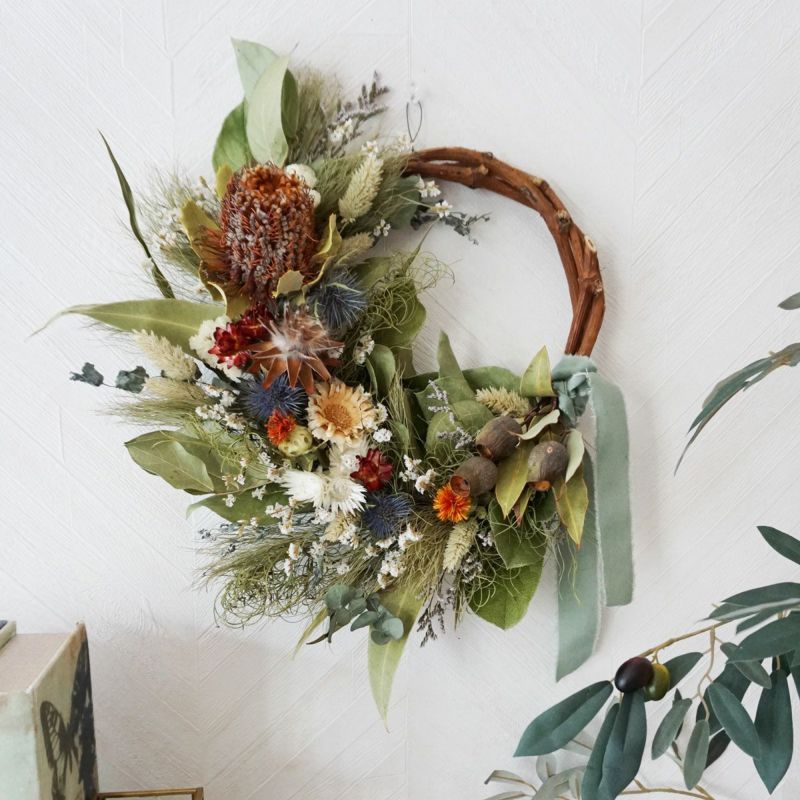 MATERIAL:バンクシア、レモンリーフ、ゴアナクロー、ベルガム、リューカデンドロン、コンパクターフラワー、ベニバナ、ヘリクリサム、ボアプランツなど。