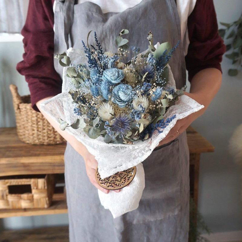 ライトブルーとネイビーの花材を合わせ、大人な雰囲気もお楽しみいただけます。