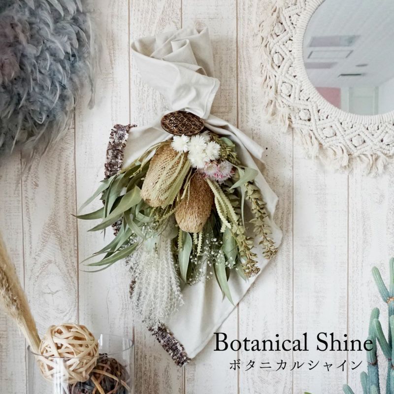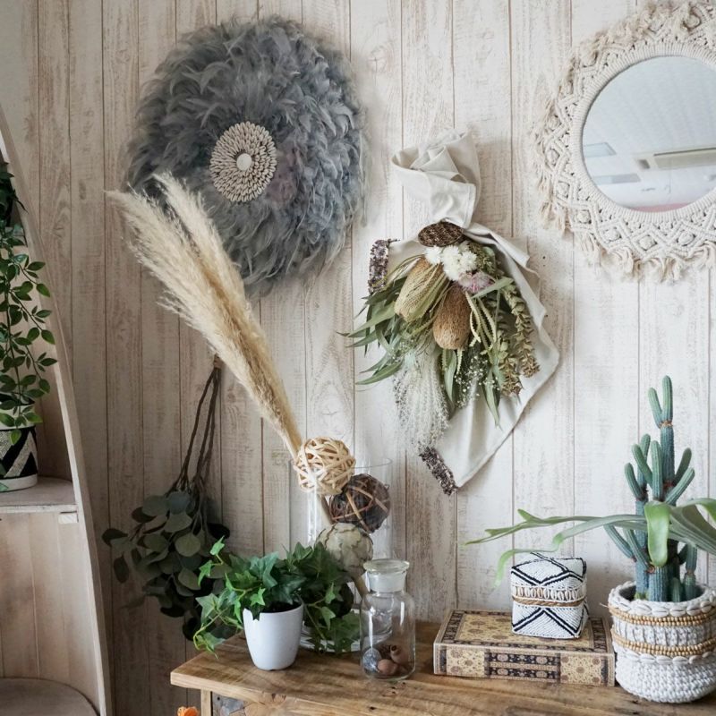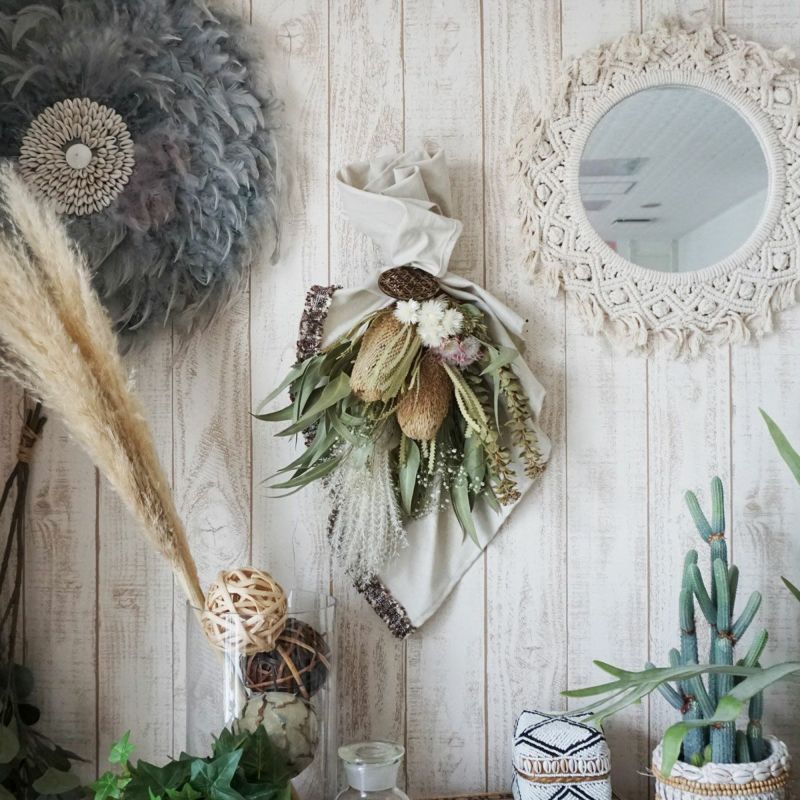 ボタニカルな雰囲気のドライフラワースワッグです。バンクシアがメインでおしゃれ。誕生日・記念日・結婚祝い・開店祝い・開業祝い・贈呈品などのプレゼントギフトにおすすめ。