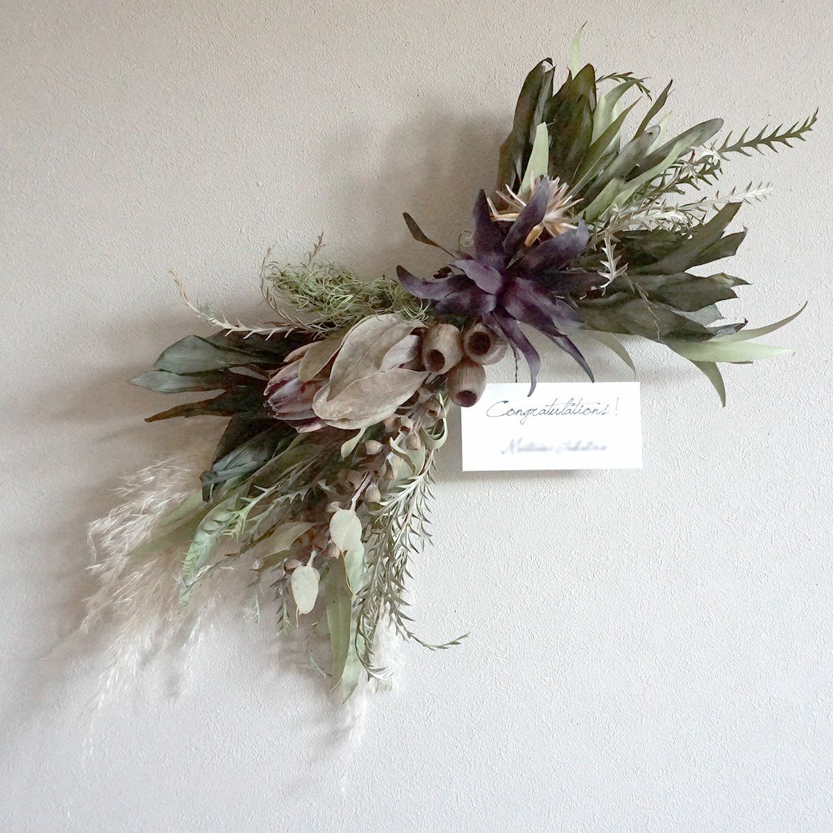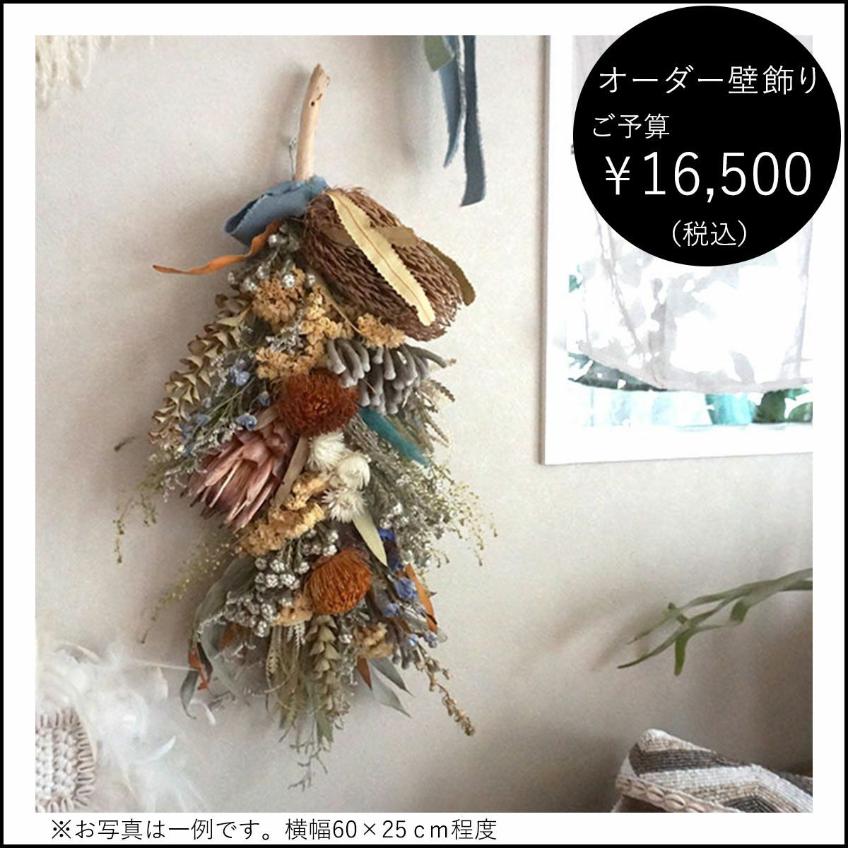 他の画像を見る オーダーメイド壁飾り 開店祝いなどの祝い花に。おしゃれで華やかなドライフラワー壁飾り。幅約60cm以上の大きめサイズ・フルオーダー<ご予算16500円> オーダーメイド 販売価格 ¥ 16,500 税込 ご予算で選べる!世界に一つだけのフルオーダーのドライフラワーを使ったウォールデコレーション。開店祝い・引っ越し祝い・結婚祝い・記念日のお祝いにもおすすめ! 詳細を見る お気に入りに登録する