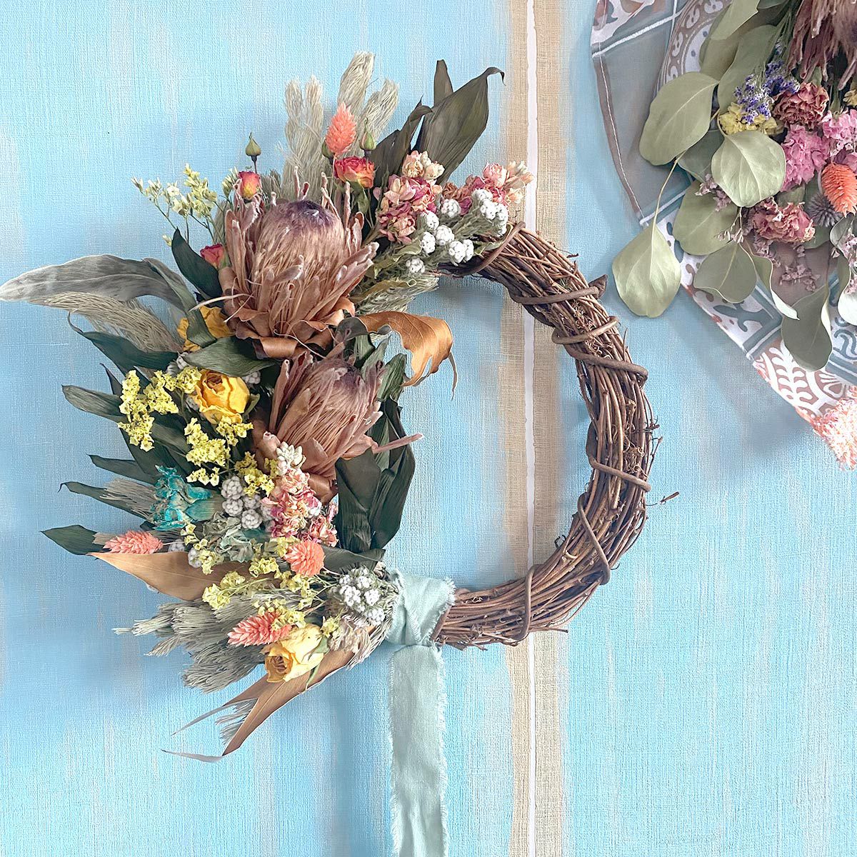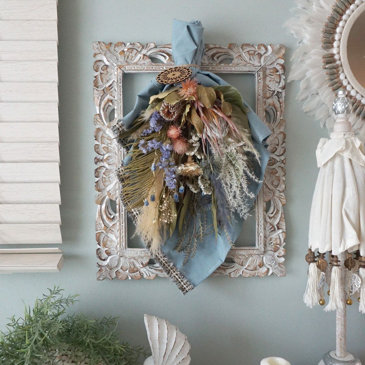 他の画像を見る 【シャビーシック】シャクヤク、リューカデンドロンなどを使用したウォールデコレーション<riley -ライリー-> 販売価格 ¥ 13,200 税込 開店祝いや店内装飾、インテリアにおすすめなドライフラワー壁飾り。青いロゼッタがワンポイントのシャビーシックなウォールデコレーションです。 詳細を見る お気に入りに登録する