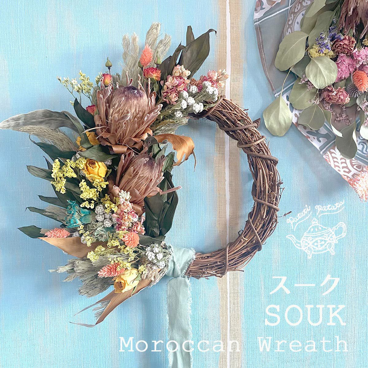他の画像を見る 【patati patata-パタティパタタ-】プロテアを贅沢にあしらったモロッカンテイストのおしゃれスワッグ<Asmaa-アスマ-> 販売価格 ¥ 13,200 税込 モロッカンインテリアにぴったりのブルームオリジナル、ドライフラワー花束スワッグ。ギフトやちょっとしたプレゼントにもぴったり!誕生日・記念日・結婚祝いにもおすすめ。 詳細を見る お気に入りに登録する