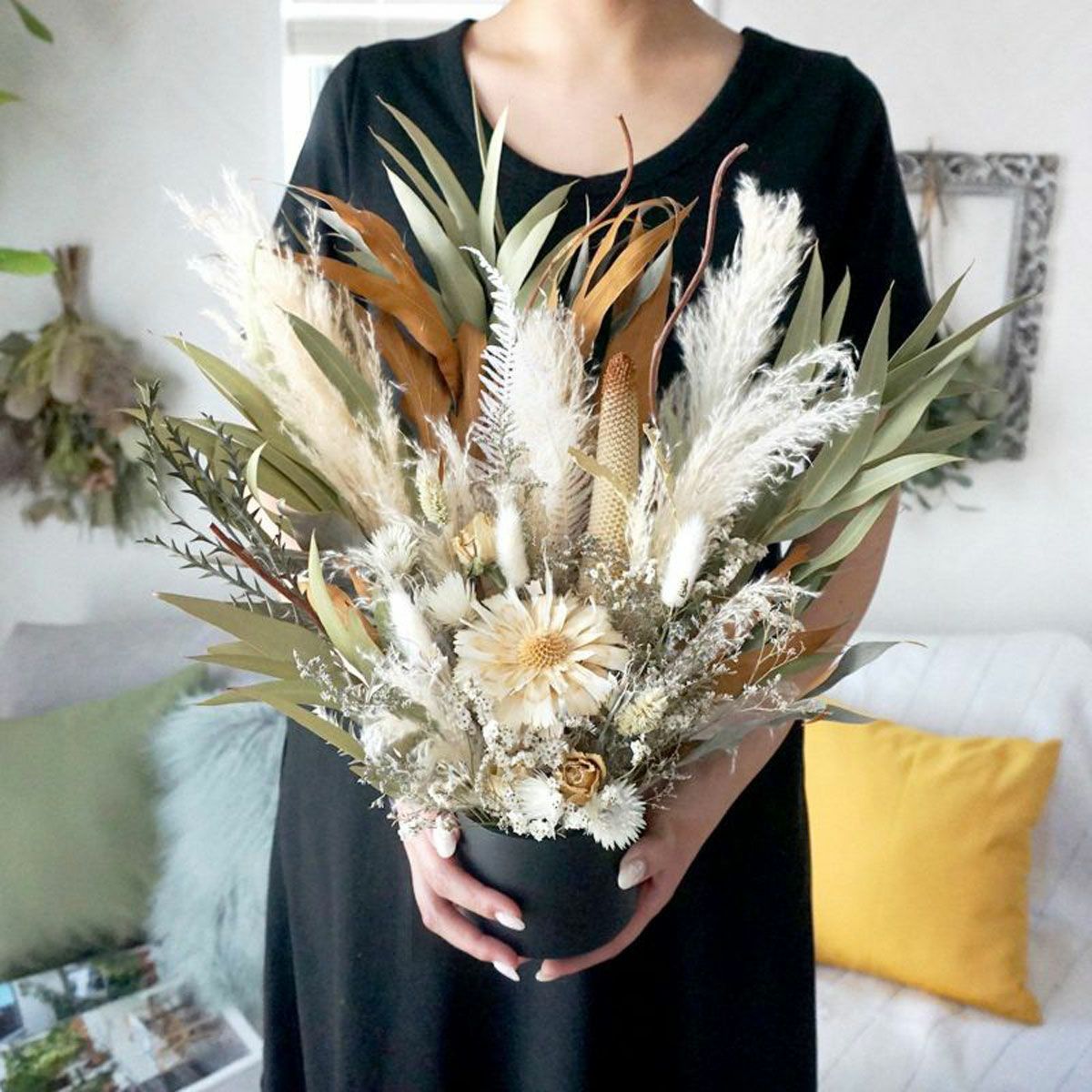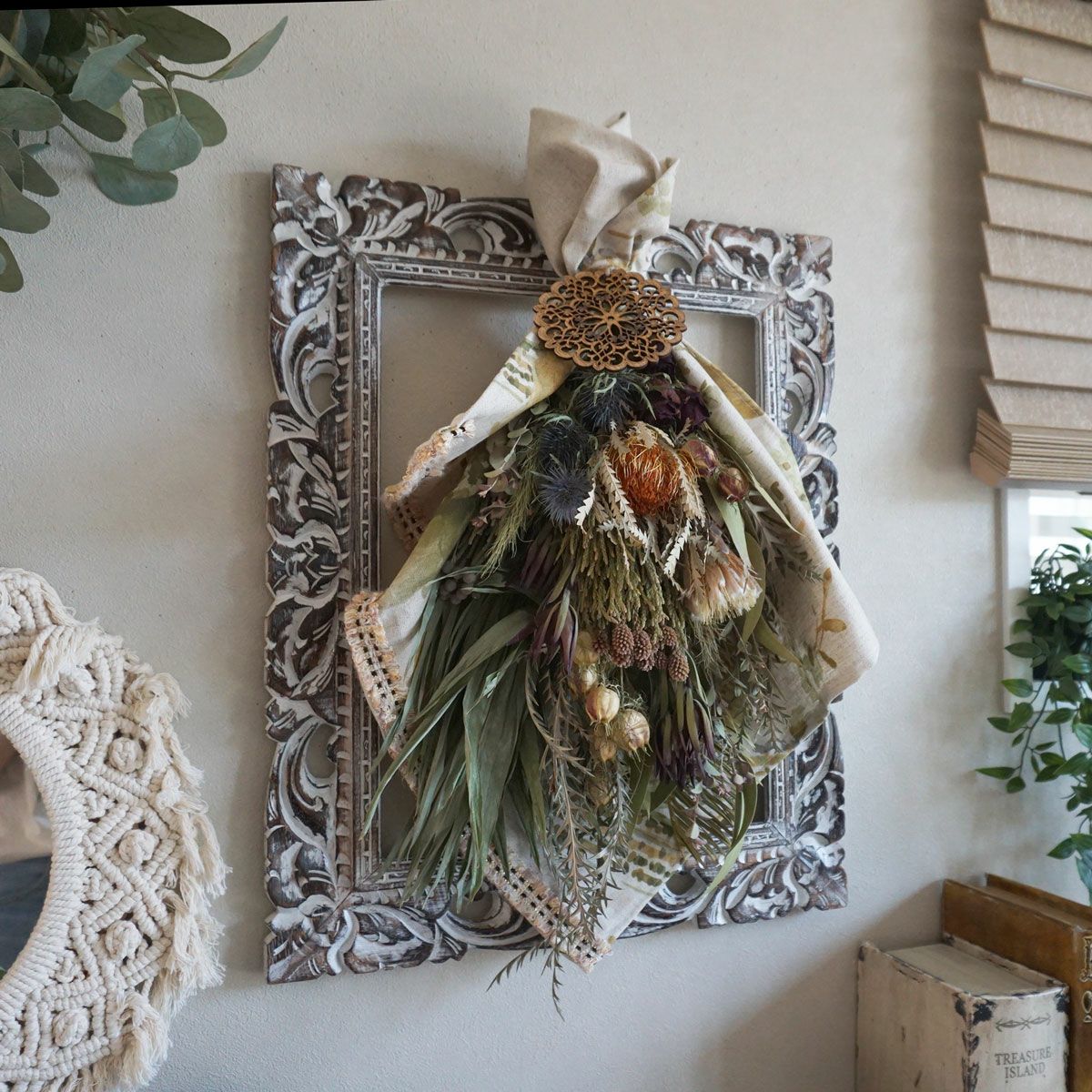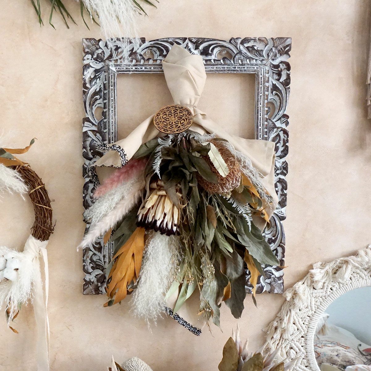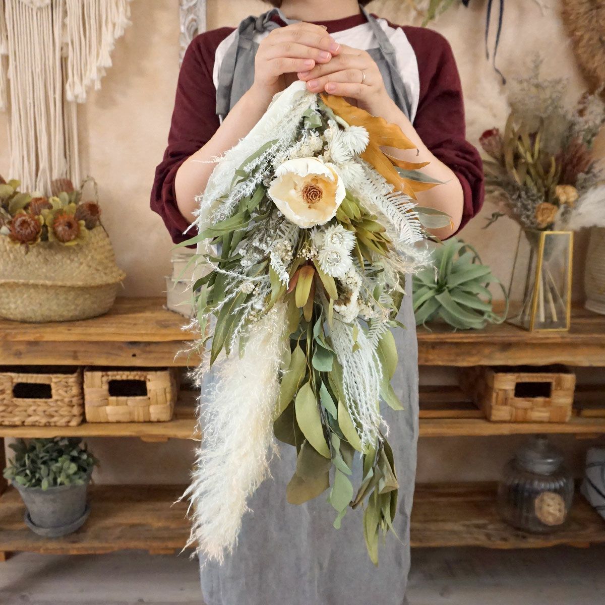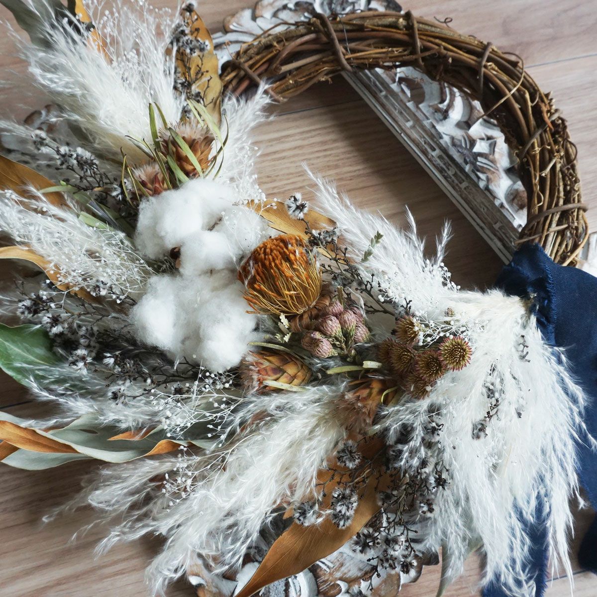 他の画像を見る 【BOHO DESIGN】バンクシアとプロテアがポイントのボーホースタイルのドライフラワースワッグ<ボヘミアン> 販売価格 ¥ 12,100 税込 バンクシアとプロテア、パンパスグラス、ラグラス、グレビレアゴールドなどを使用した大き目のスワッグです。ボヘミアンな雰囲気はボーホースタイルのお部屋にぴったり! 詳細を見る お気に入りに登録する
