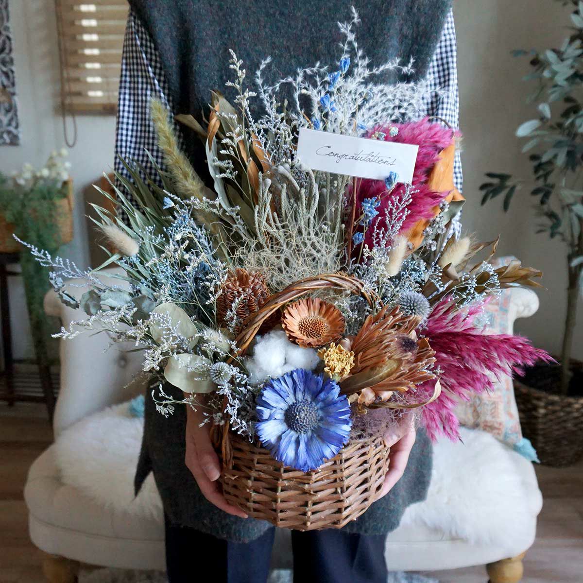 他の画像を見る 開店祝いや結婚祝いなどにおすすめ!スモークツリーやプロテアを使ったドライフラワーバスケット<スパイス> 販売価格 ¥ 11,000 税込 在庫切れ 開店祝いや誕生日プレゼント、結婚祝いにおすすめな直径約20cmのドライフラワーバスケット。バスケット内の生地もお好みのものをお選びいただけます。お写真と同じデザインの生地を希望の場合は「お花のイメージでスタッフにおまかせする」をご選択ください。ドライフラワーバスケットは置くだけでインテリアになるので、簡単にお花をお楽しみいただけます。無料でクリアフィルムラッピングもしていますので、ぜひプレゼントにご検討くださいませ。 詳細を見る お気に入りに登録する
