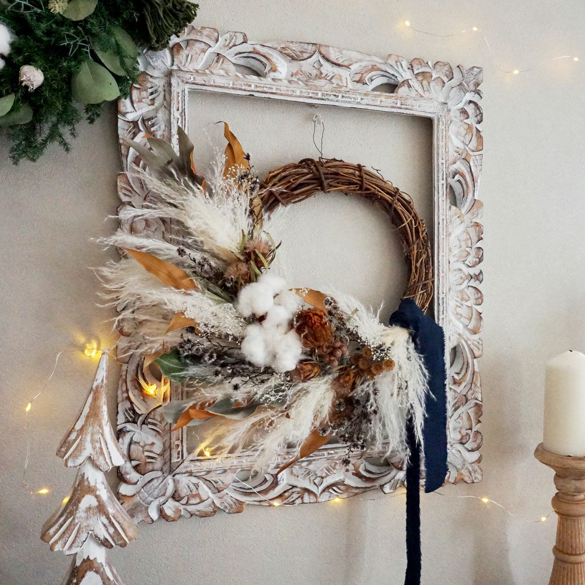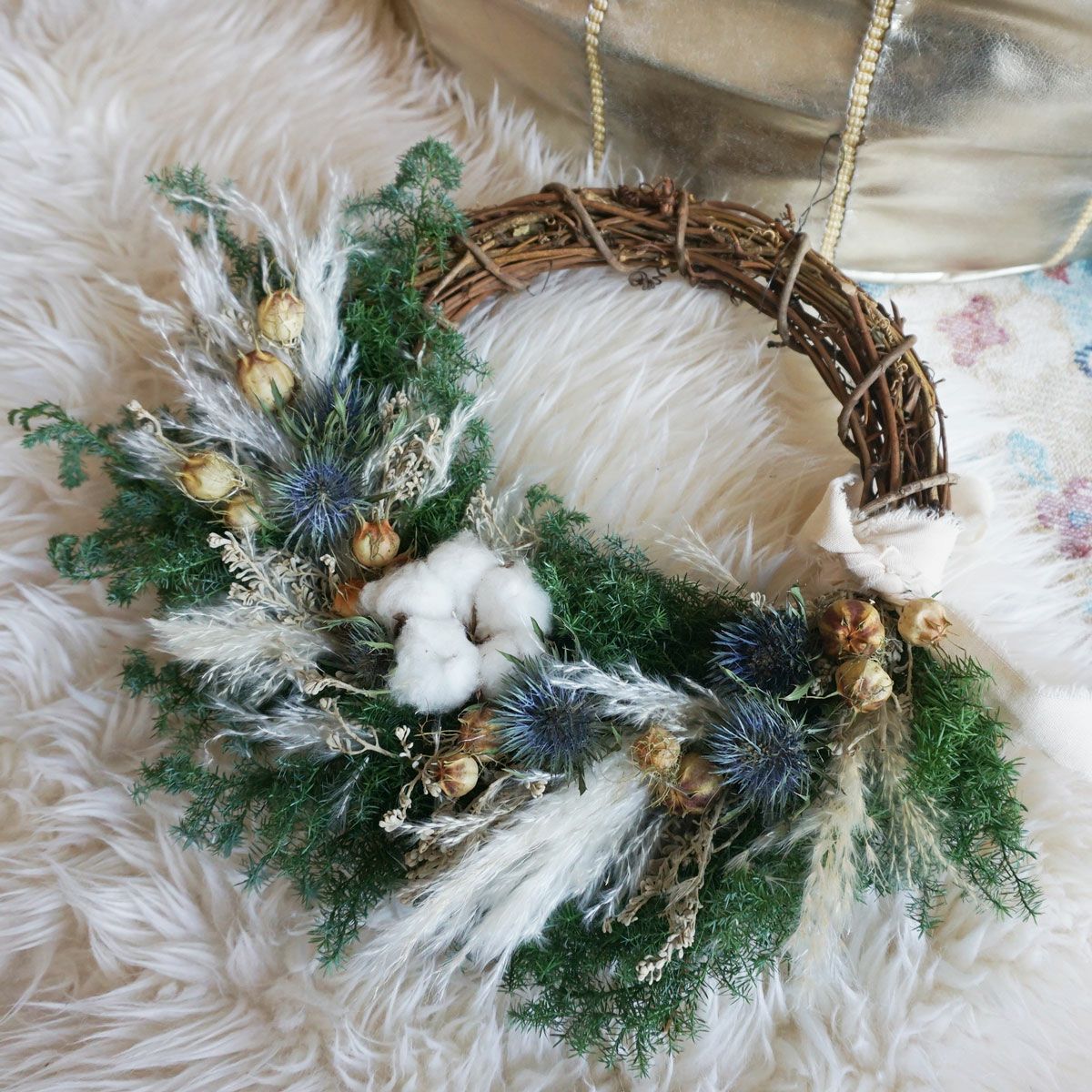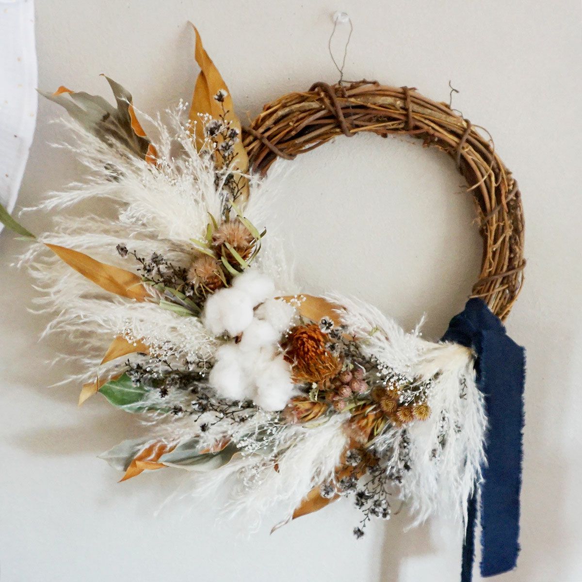 他の画像を見る 【冬のインテリアにおすすめ】パンパス、コットン、ドライアンドラを使ったふわふわリース<ルミ> 販売価格 ¥ 12,100 税込 【冬のインテリアにおすすめ!】パンパスグラス、コットン、ドライアンドラを使ったふわふわリースです。やさしく上品に仕上げています。 詳細を見る お気に入りに登録する