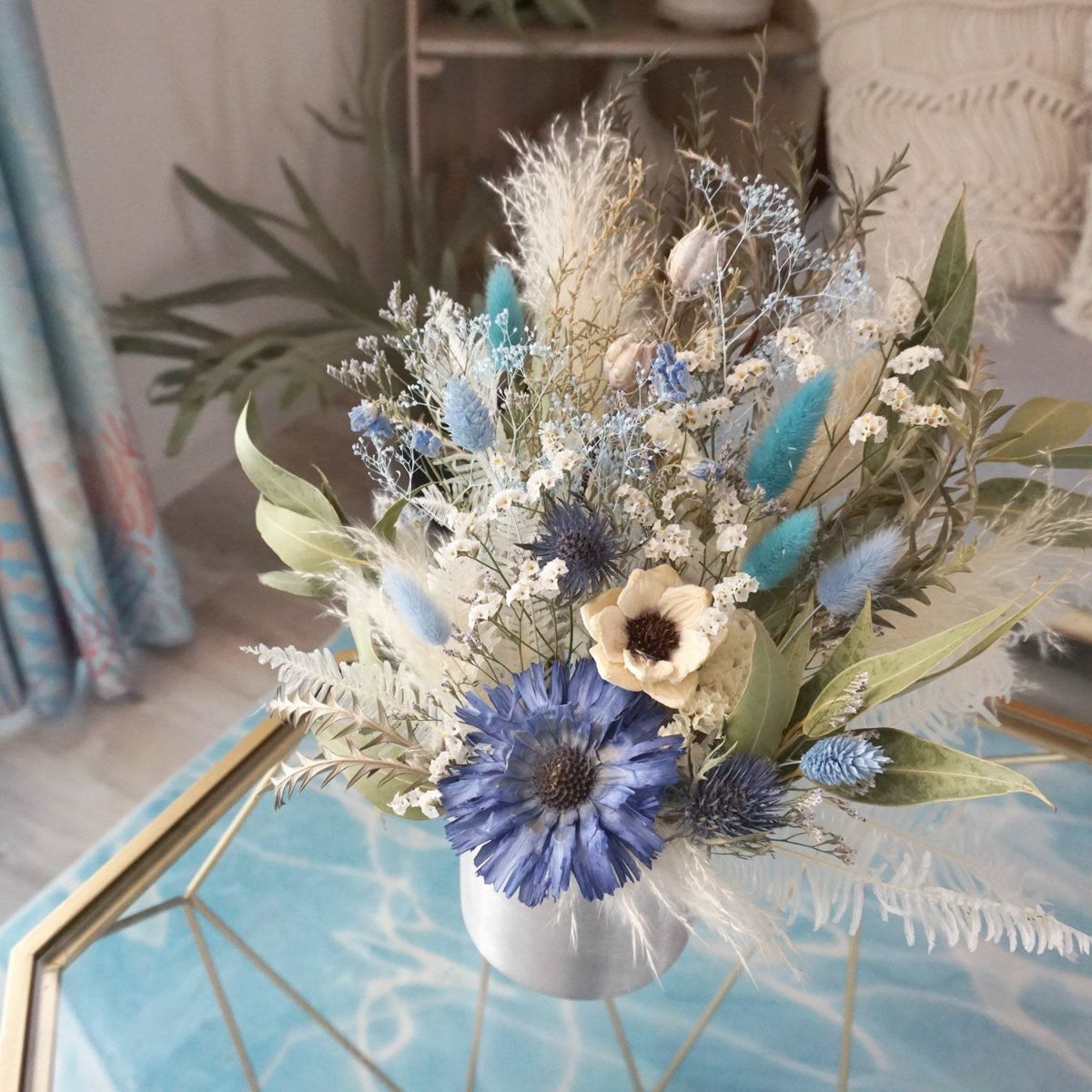 他の画像を見る 【marine & pier -マリンピア-】海を感じるお祝いにぴったりな鉢型アレンジ<マーレブルー> 販売価格 ¥ 13,200 税込 海を感じるブルーカラーの置き型ドライフラワーアレンジメントです。シルバーカラーのポットにお花をアレンジしているので、飾り方も置くだけで簡単です。ブルーのリペンスロゼッタやラグラスがポイントです。立札も無料でお付けできますので、開店祝い・新築祝い・結婚祝いなどにおすすめです。 詳細を見る お気に入りに登録する
