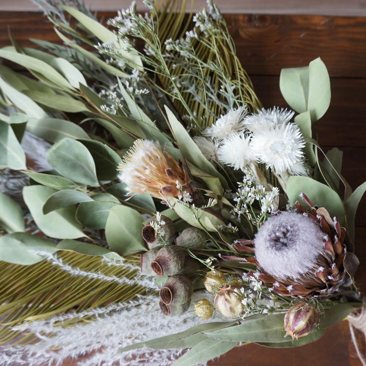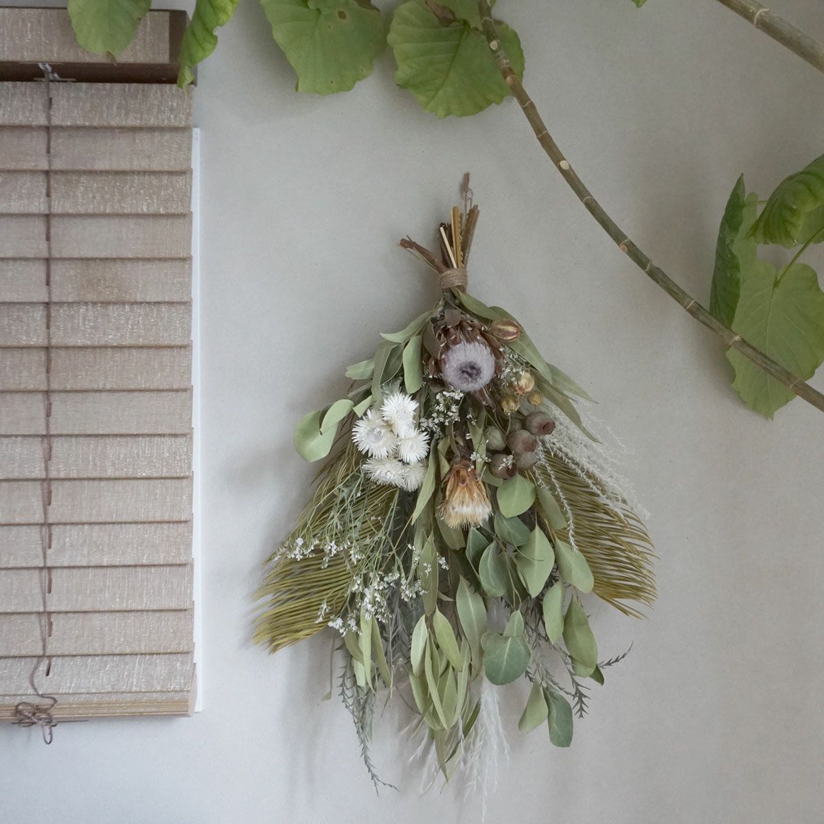 他の画像を見る 【ボタニカル】プロテアやグリーンリーフいっぱいの爽やかな大きめスワッグ<ボタニカルシャワー> 販売価格 ¥ 8,800 税込 プロテアとグリーンリーフを贅沢にあしらったボタニカルスワッグです。ユーカリやソテツなどでボリューミーに作成いたしました。爽やかなナチュラルスワッグ。なるべく自然素材を生かしたスタイルで壁に飾りたいというお客様におすすめです。 詳細を見る お気に入りに登録する