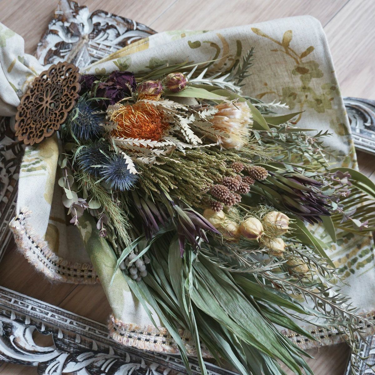 他の画像を見る 【BOHO DESIGN】プロテア・リューカデンドロンなどのワイルドフラワーを使ったボーホースタイルのドライフラワースワッグ・花束<ボーホークイーン> 販売価格 ¥ 11,000 税込 プロテア、ドライアンドラ、リューカデンドロン、パンパスグラス、バラなどを使った縦60cmの大き目のスワッグです。アンティークな雰囲気も感じられるスワッグはボーホースタイル以外にもシャビーシックなお部屋にもよく合います。ポイントは当店でしか扱っていないモロッコのお守り「ファティマ」のチャーム。他とは違うユニークな花束を贈りたい方におすすめです。メッセージカードをつけて誕生日・記念日・結婚祝いにもご利用いただけます。 詳細を見る お気に入りに登録する