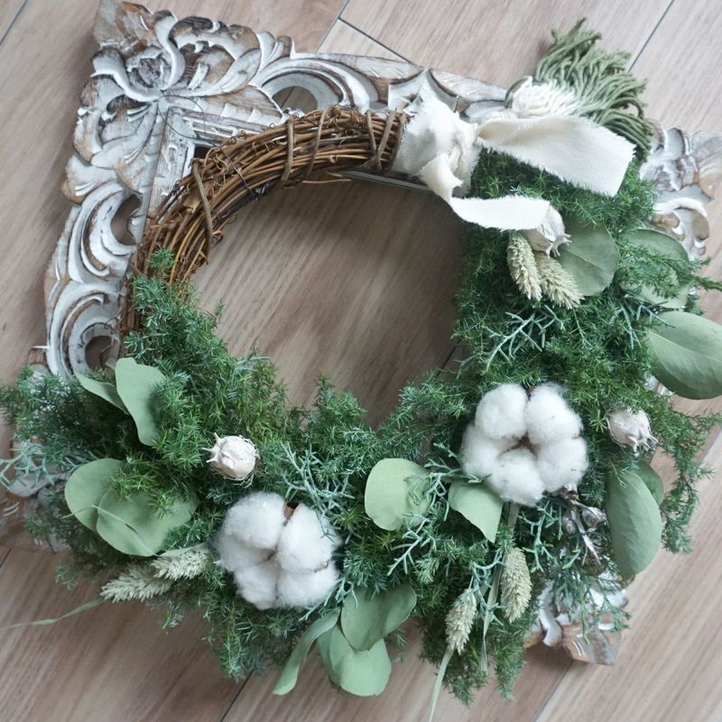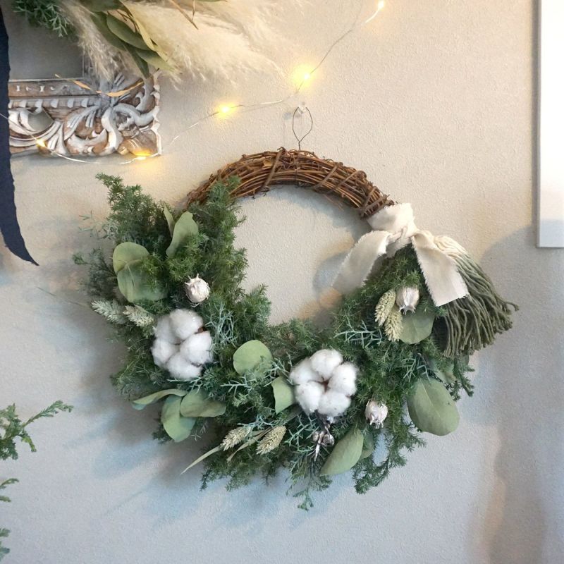 ユーカリやコットン、ヒムロスギなどを使ったリース(ウォールデコレーション)です。
