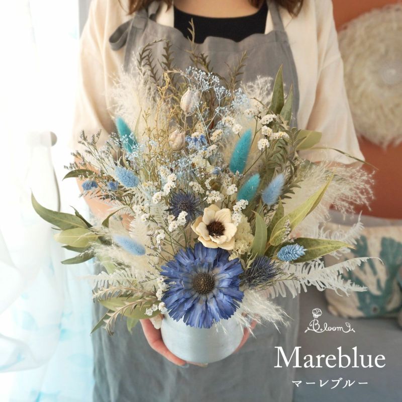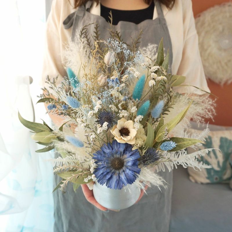 海を感じるブルーカラーの置き型ドライフラワーアレンジメントです。
