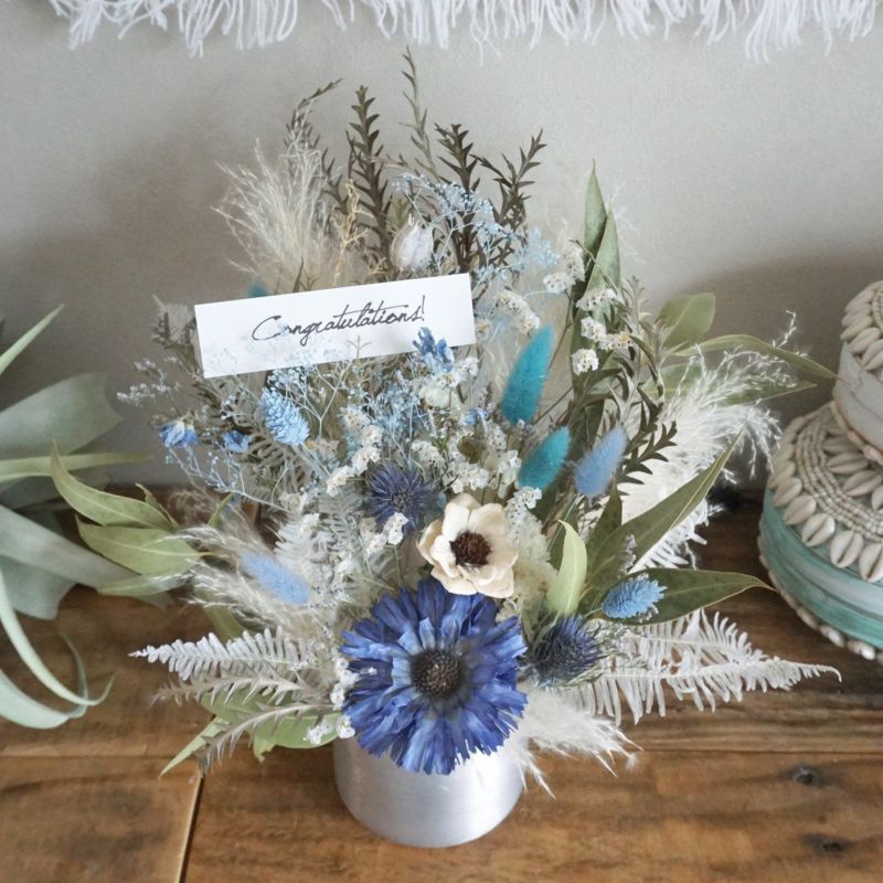 海を感じるブルーカラーの置き型ドライフラワーアレンジメントです。シルバーカラーのポットにお花をアレンジしているので、飾り方も置くだけで簡単です。ブルーのリペンスロゼッタやラグラスがポイントです。立札も無料でお付けできますので、開店祝い・新築祝い・結婚祝いなどにおすすめです。