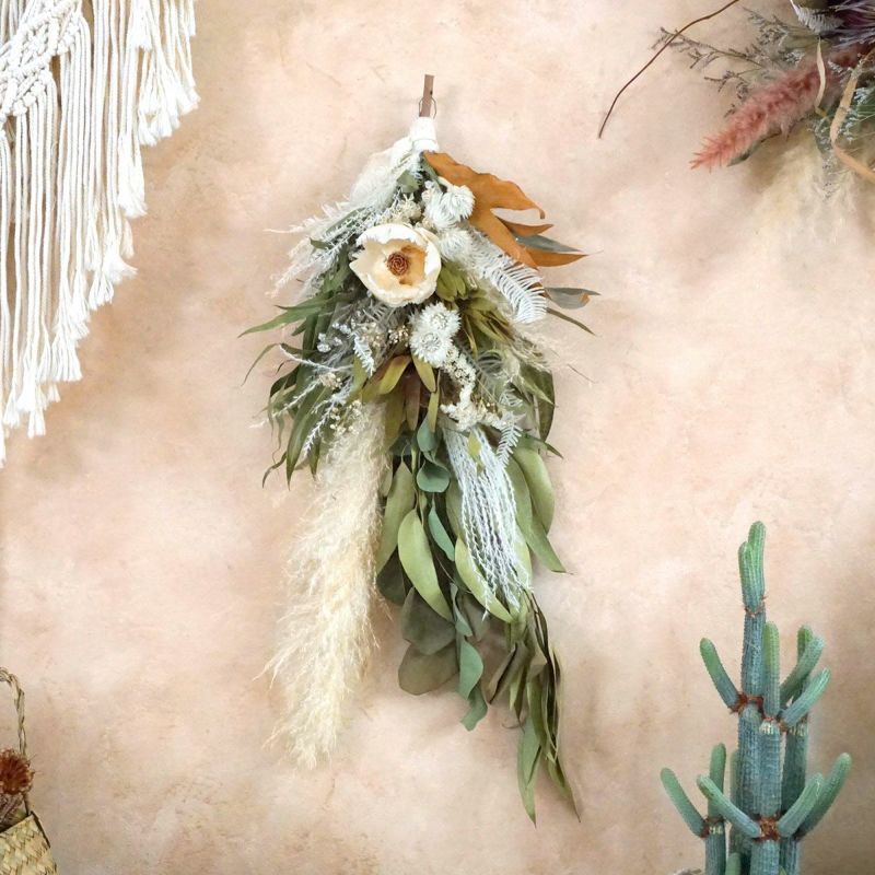 パームフラワー、パンパスグラス、ユーカリ、エバーラスティングなどをお入れしたボーホースタイルのウォールデコ(壁飾り)です。