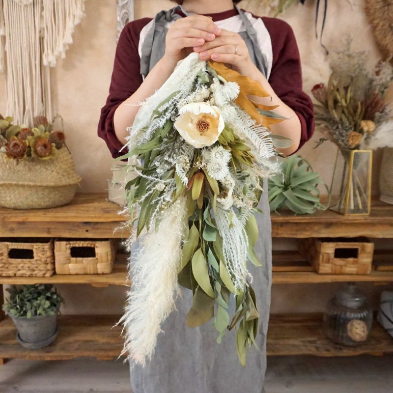 MATERIAL:パームフラワー、パンパスグラス、ユーカリ、エバーラスティング、白シダ、カスミソウなど