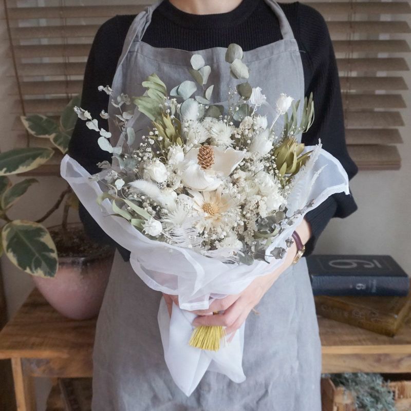 結婚祝いや出産祝いにオススメのホワイトブーケです。