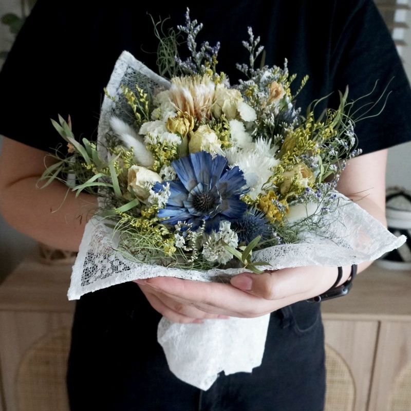 大切な人が幸せになりますようにと願いをこめたサムシングブルーの花束です。
