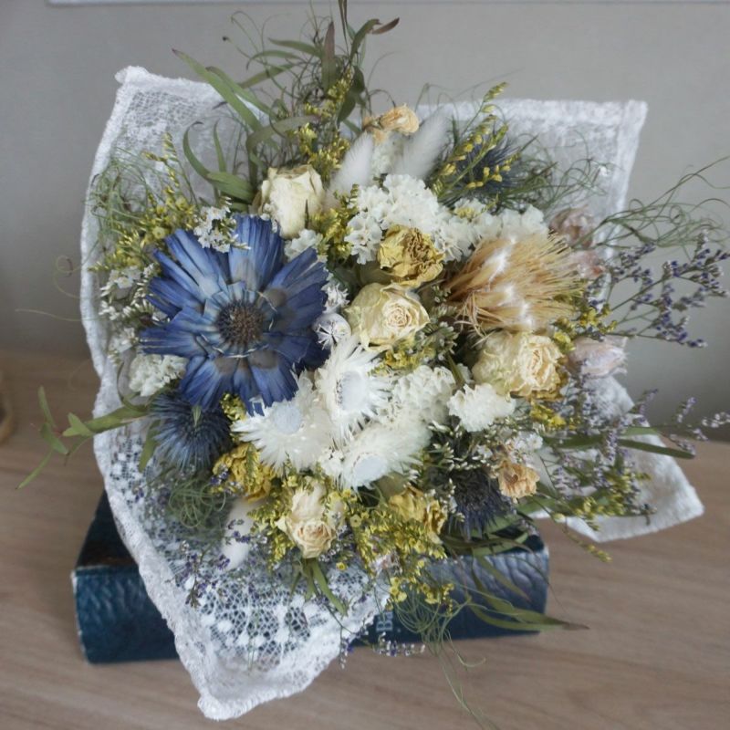 MATERIAL:リペンスロゼッタ、プロテア、ローズ、エリンジウム、スターチス、ハイブリットスターチス、エバーラスティング、ユーカリ、ゴアナクローなど