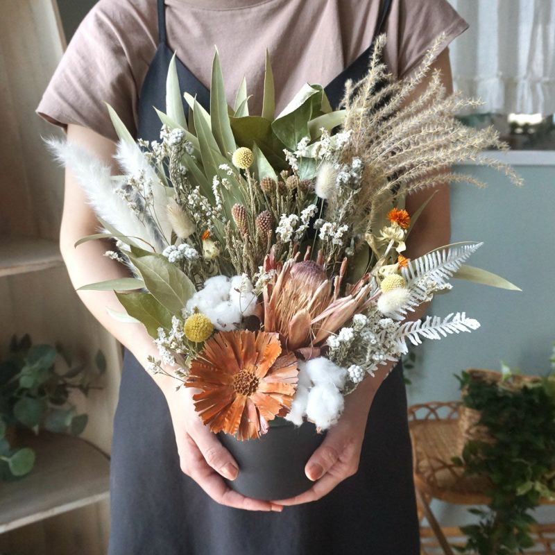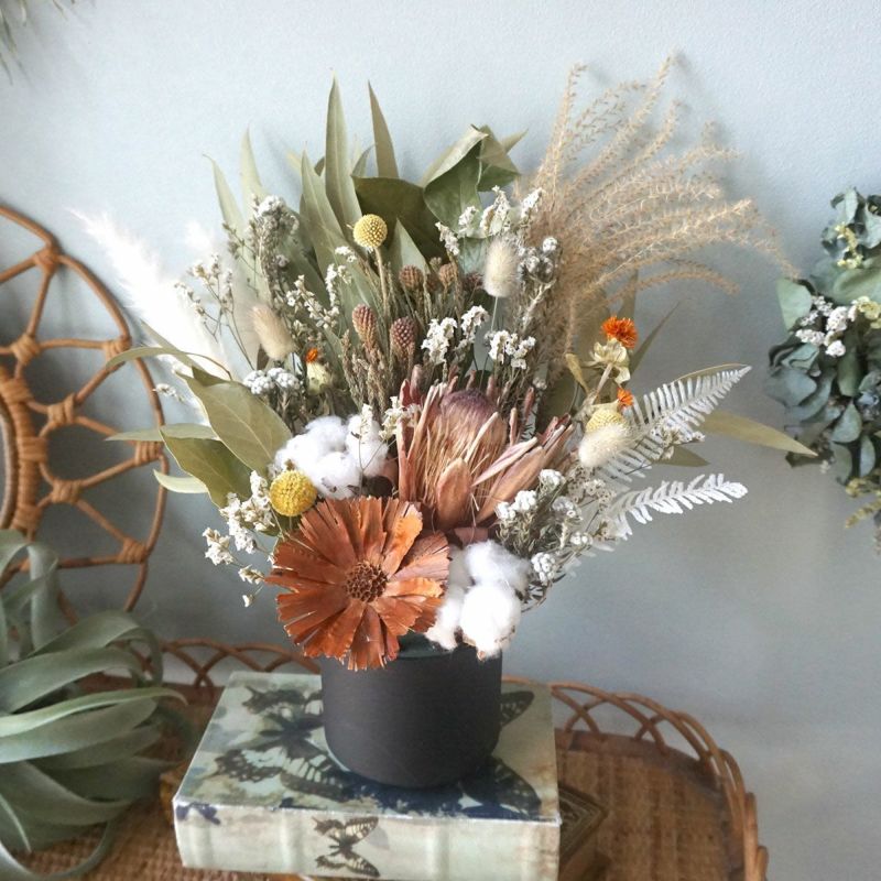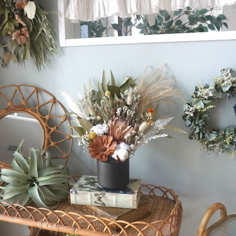 開店祝い・引っ越し祝い・結婚祝い・出産祝いなどにおすすめ!ボタニカルな雰囲気の花材を使用した置き型ドライフラワーアレンジメントです。ギフトやちょっとしたプレゼントにもぴったり!誕生日・記念日・結婚祝いにもおすすめ。