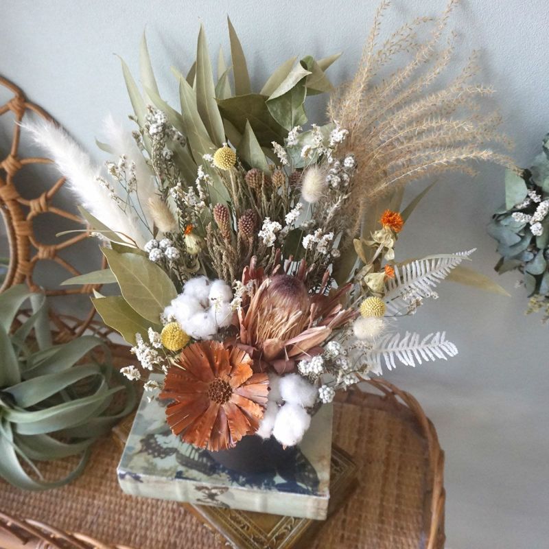リペンスロゼッタ、ススキ、コットン、プロテア、レッドブルニア、クラスペディア、ベニバナなど
