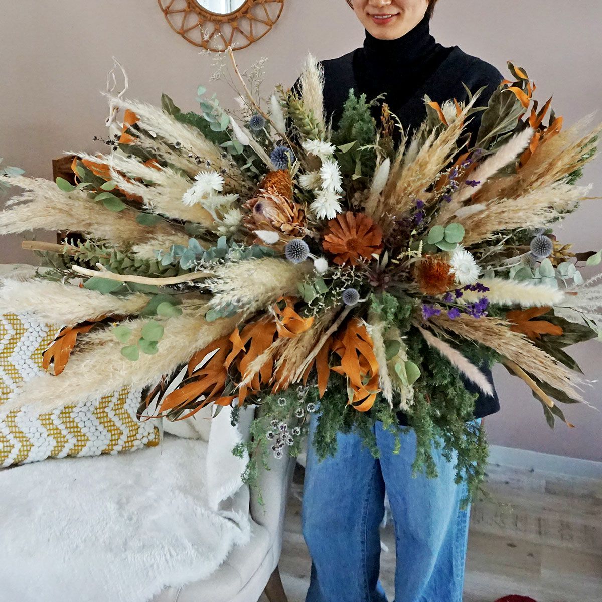 他の画像を見る ビッグサイズ!プロテアなどのワイルドフラワーをたっぷり使った存在感のあるおしゃれなドライフラワーのウォールデコレーション<Hannah-ハンナ-> 販売価格 ¥ 66,000 税込 在庫切れ 豪華なワイルドフラワーのドライフラワーを使ったナチュラルなウォールデコレーション。開店祝い・引っ越し祝い・記念日のお祝いにも! 詳細を見る お気に入りに登録する