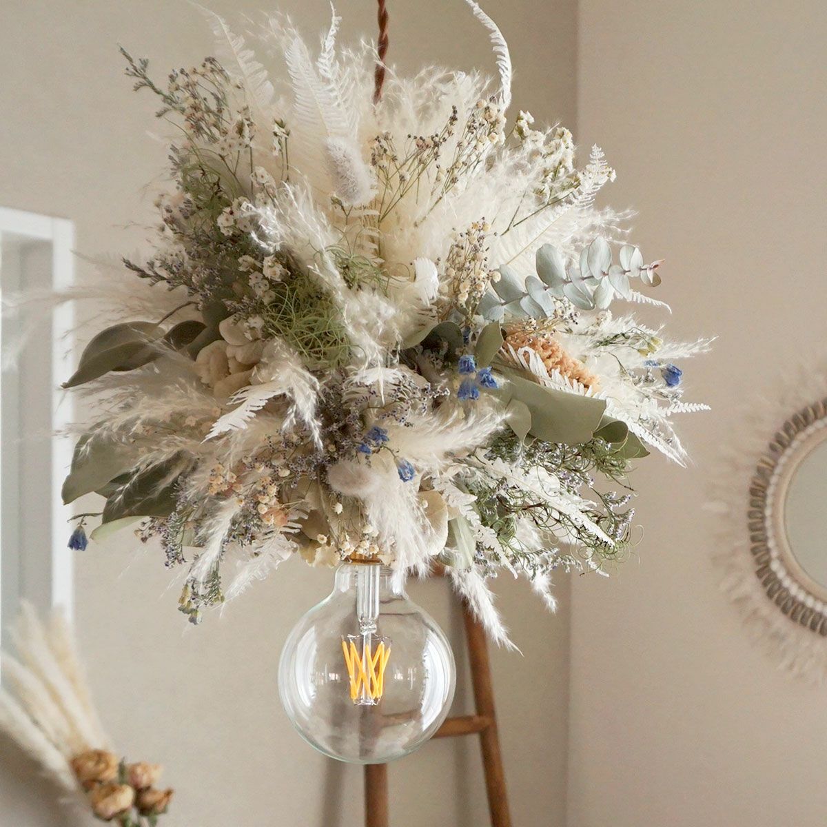 他の画像を見る 【ドライフラワー照明・5灯式シャンデリア(直径約50cm)】パンパスグラス<ホワイトフォレスティ> 販売価格 ¥ 44,000 税込 シャンデリアにふわふわなパンパスとドライフラワーをあしらいました。サロンやカフェなどの店内装飾・ディスプレイやお部屋のインテリアに。おしゃれなドライフラワー照明・シャンデリア・ライトは、開店祝いや新築祝い、プレゼントギフトなどにおすすめです。 詳細を見る お気に入りに登録する