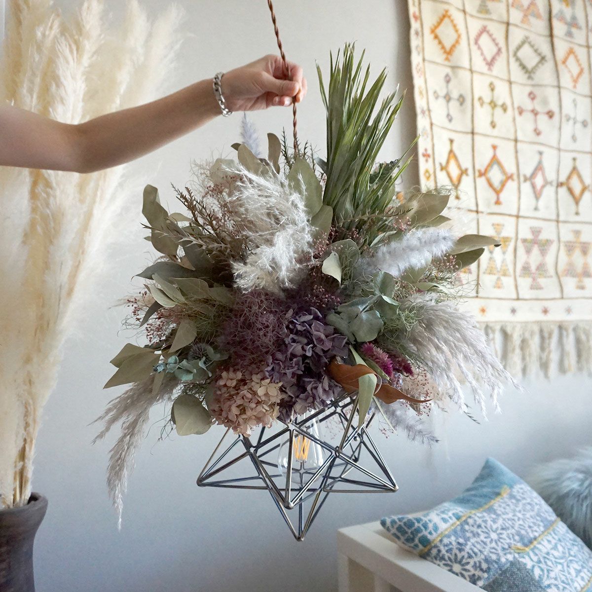 他の画像を見る 【ドライフラワー照明・1灯式星型ペンダントライト(直径約40cm)】パンパスグラス・アジサイ・スモークツリー<ジュピター> 販売価格 ¥ 38,500 税込 在庫切れ 星の形がかわいい照明!サロンやカフェなどの店内装飾・ディスプレイやお部屋のインテリアに。おしゃれなドライフラワーを使ったペンダントライト・照明 詳細を見る お気に入りに登録する