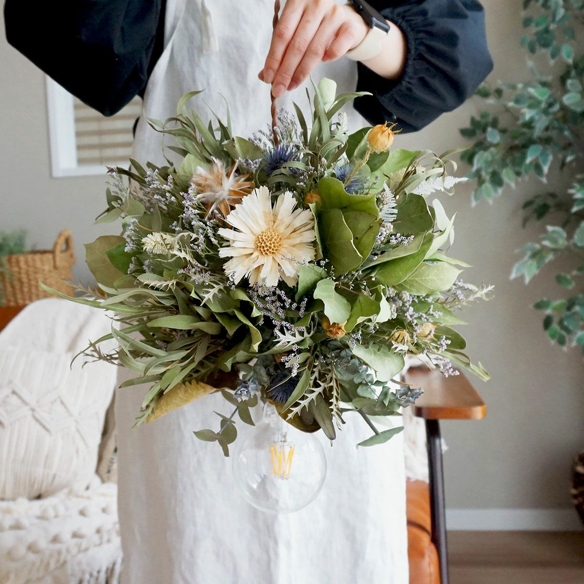 他の画像を見る 【ドライフラワー照明・1灯式ペンダントライト(直径約43cm)】パンパスグラスやワイルドフラワー使用<セレーナ> 販売価格 ¥ 38,500 税込 サロンやカフェなどの店内装飾・ディスプレイやお部屋のインテリアに。おしゃれなドライフラワーを使ったペンダントライト・照明。開業祝い・開店祝い・新築祝い・プレゼントギフトにもおすすめ。 詳細を見る お気に入りに登録する