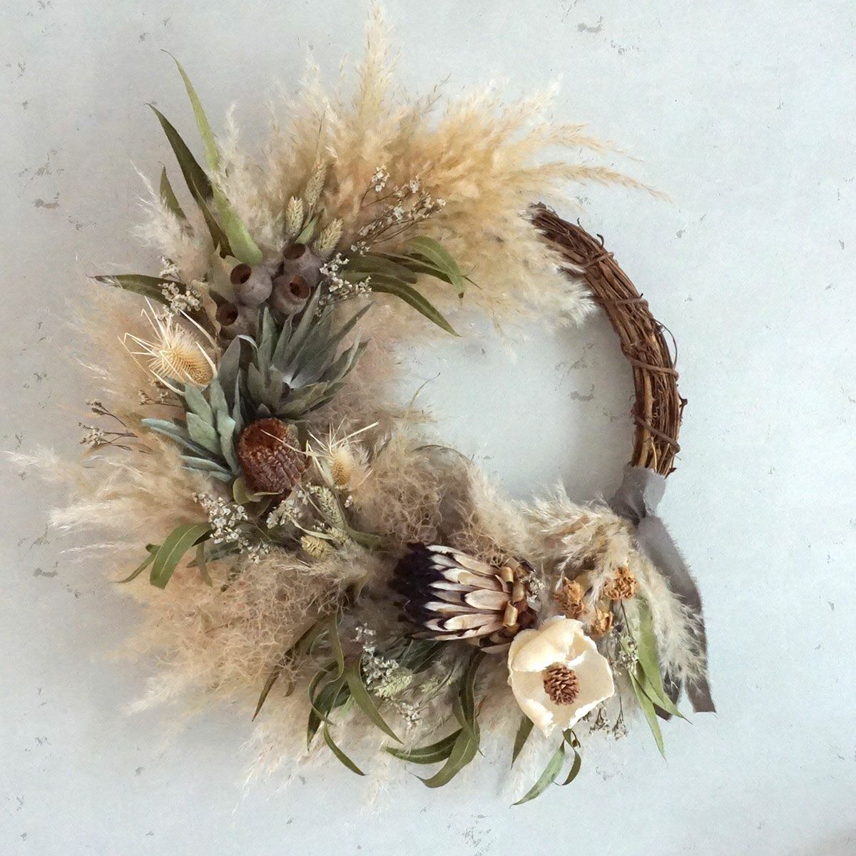 他の画像を見る 【BOHO DESIGN】パンパスグラスやプロテアが入ったビッグリース<ヒッピー> 販売価格 ¥ 39,600 税込 パンパスグラスやプロテアな豪華な花材を使用したビッグリースです。ボヘミアンな雰囲気はボーホースタイルのお部屋にぴったり!ギフトや開店祝いなどにもおすすめです。 詳細を見る お気に入りに登録する