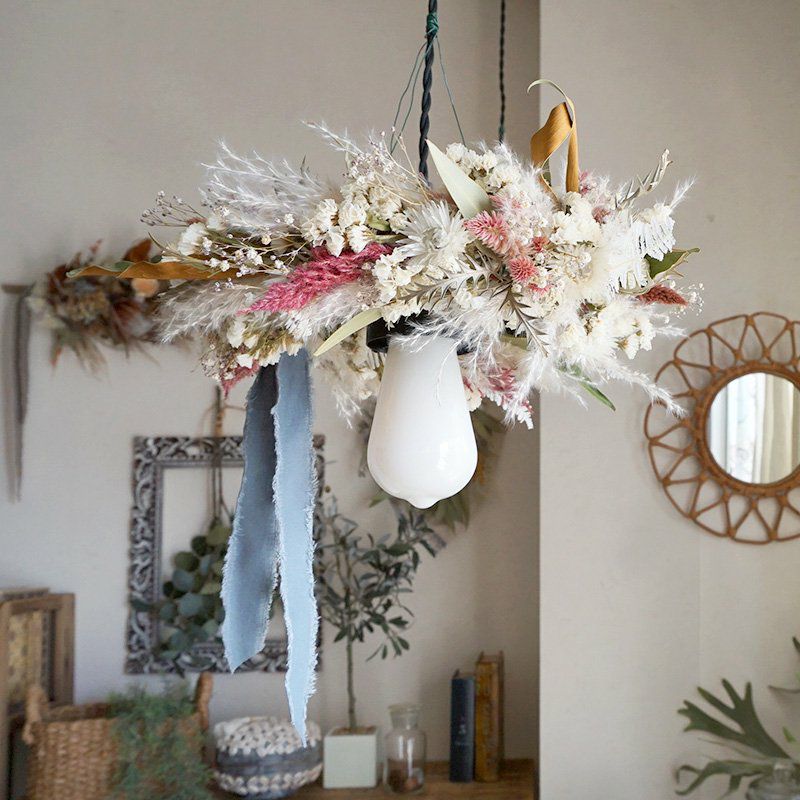 他の画像を見る 【ドライフラワー照明・1灯式ペンダントライト(直径約30cm)】パンパスグラス・カスミソウ<マロン> 販売価格 ¥ 19,800 税込 在庫切れ パンパスグラスがかわいいフライングリースの照明。サロンやカフェなどの店内装飾・ディスプレイやお部屋のインテリアに。おしゃれなドライフラワー照明・シャンデリア・ライトは、開店祝いや新築祝い、プレゼントギフトなどにおすすめです。 詳細を見る お気に入りに登録する